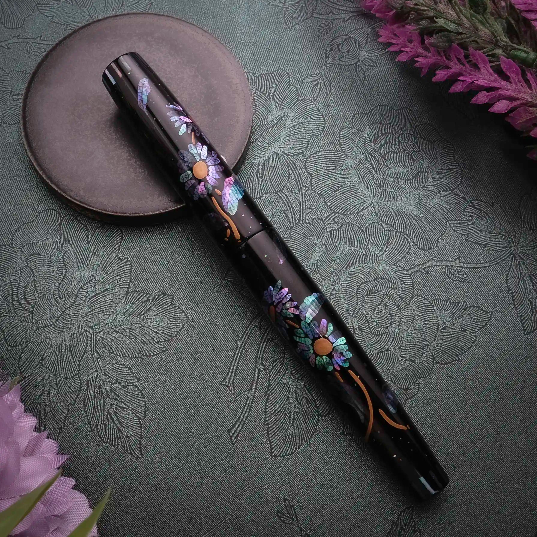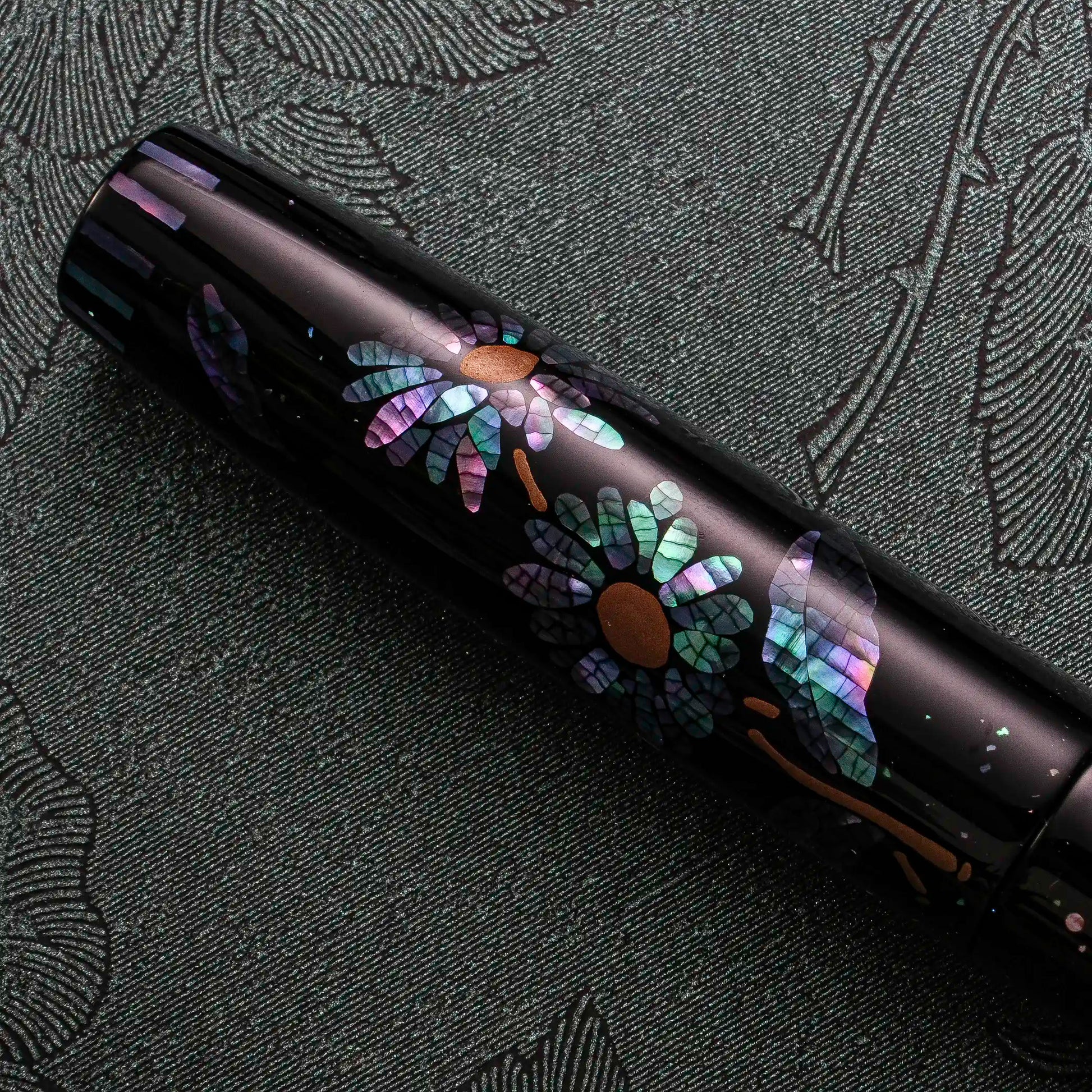 The fountain pen is coated with black urushi lacquer and in-laid with radiant raden (mother-of-pearl) flakes to form the daisy floral patterns or glittering stripes at the ends of the pen. Such exquisite handcrafted decoration took months to complete and the quantity is limited.
