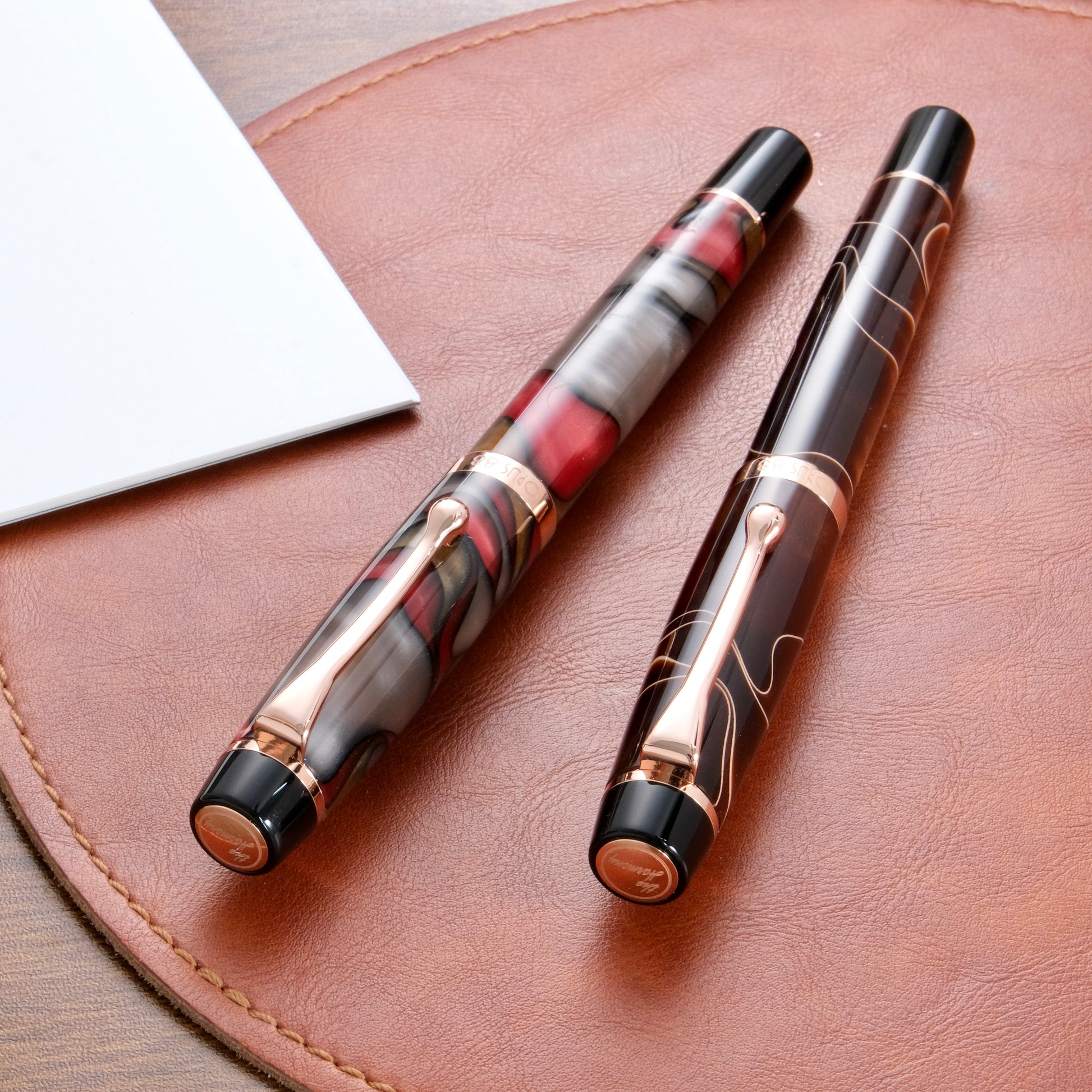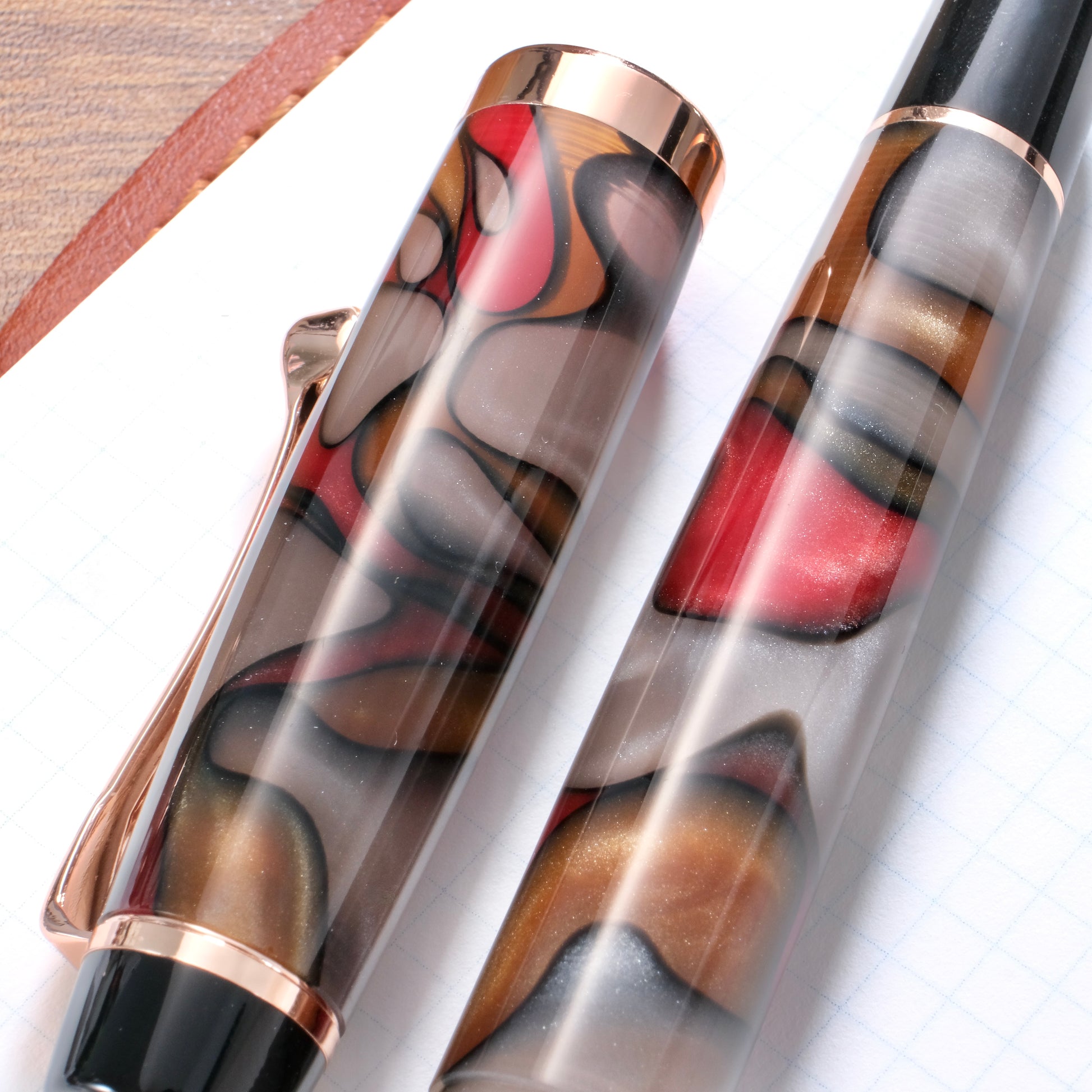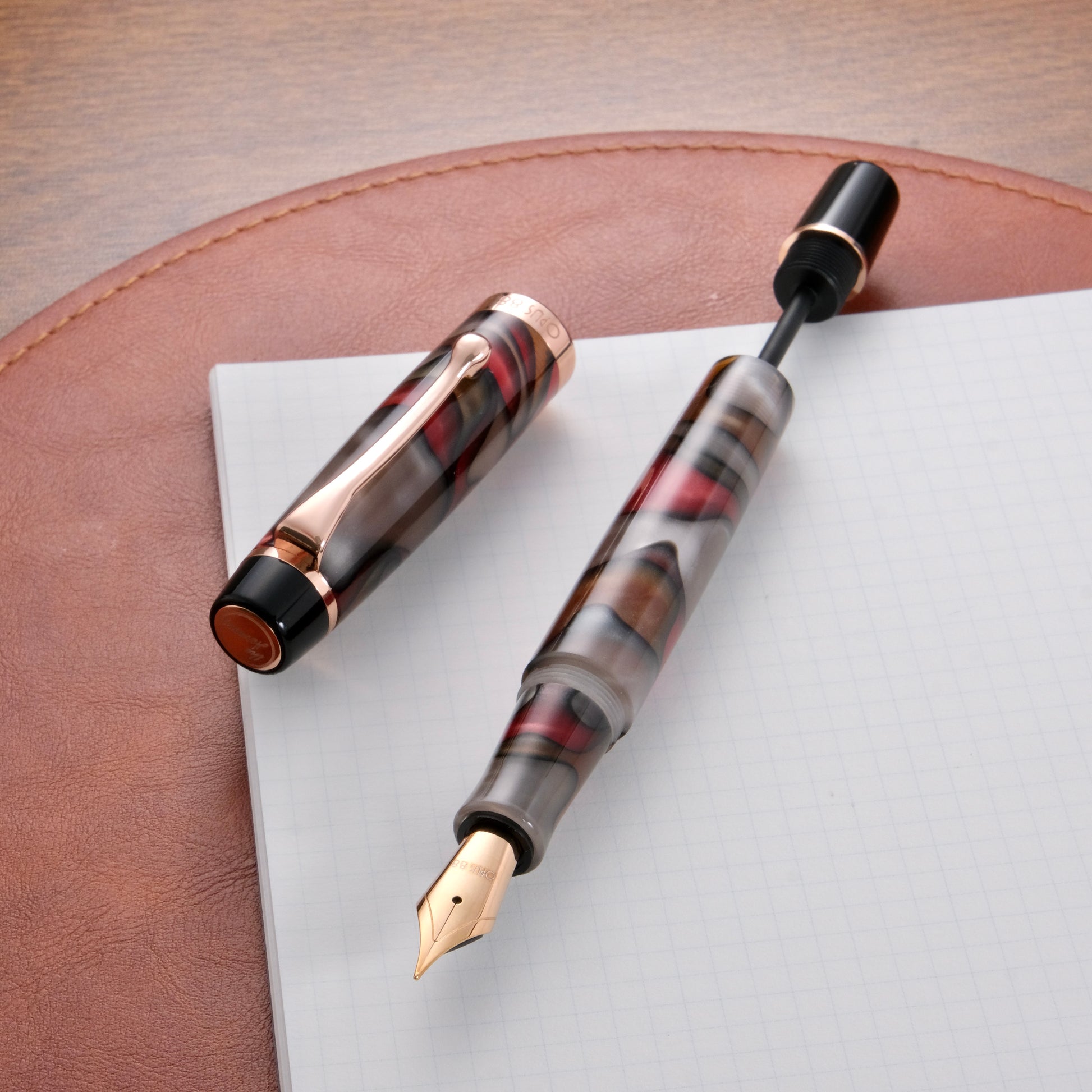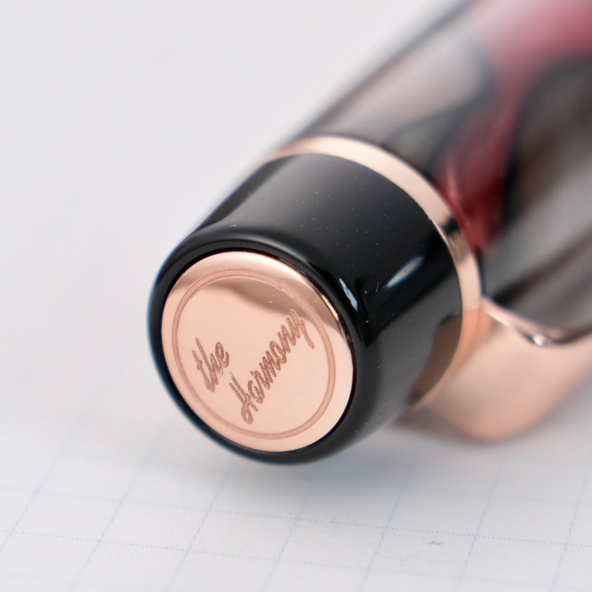 The nib and trim are electroplated with a rose gold finish in Taiwan, complemented, respectively, by a coffee-colored or grayish-red marble patterned barrel. This design has elegant feel to it, embodying the romantic essence of the 1930s. Each Harmony is uniquely adorned with its own distinctive grain pattern.