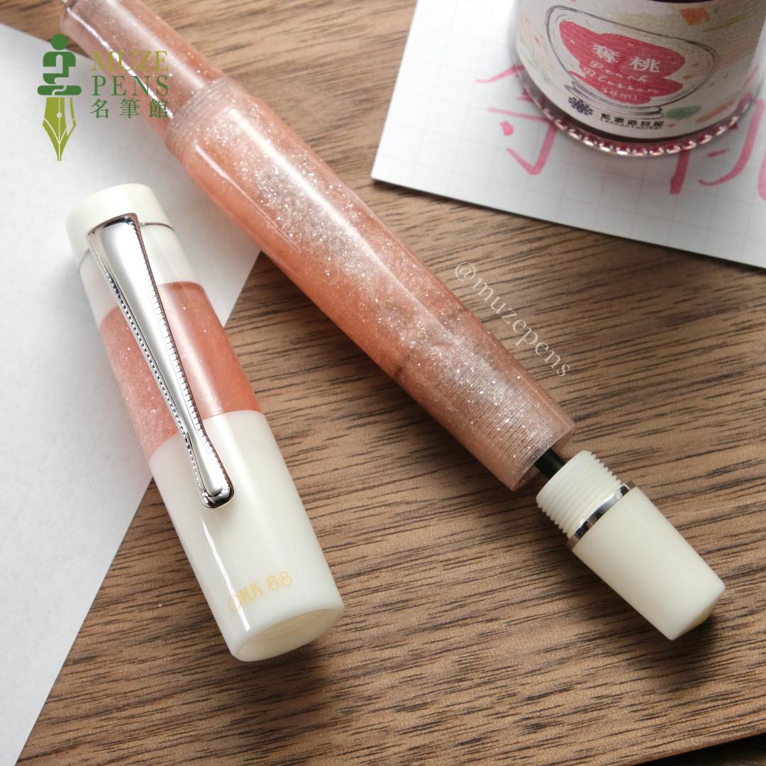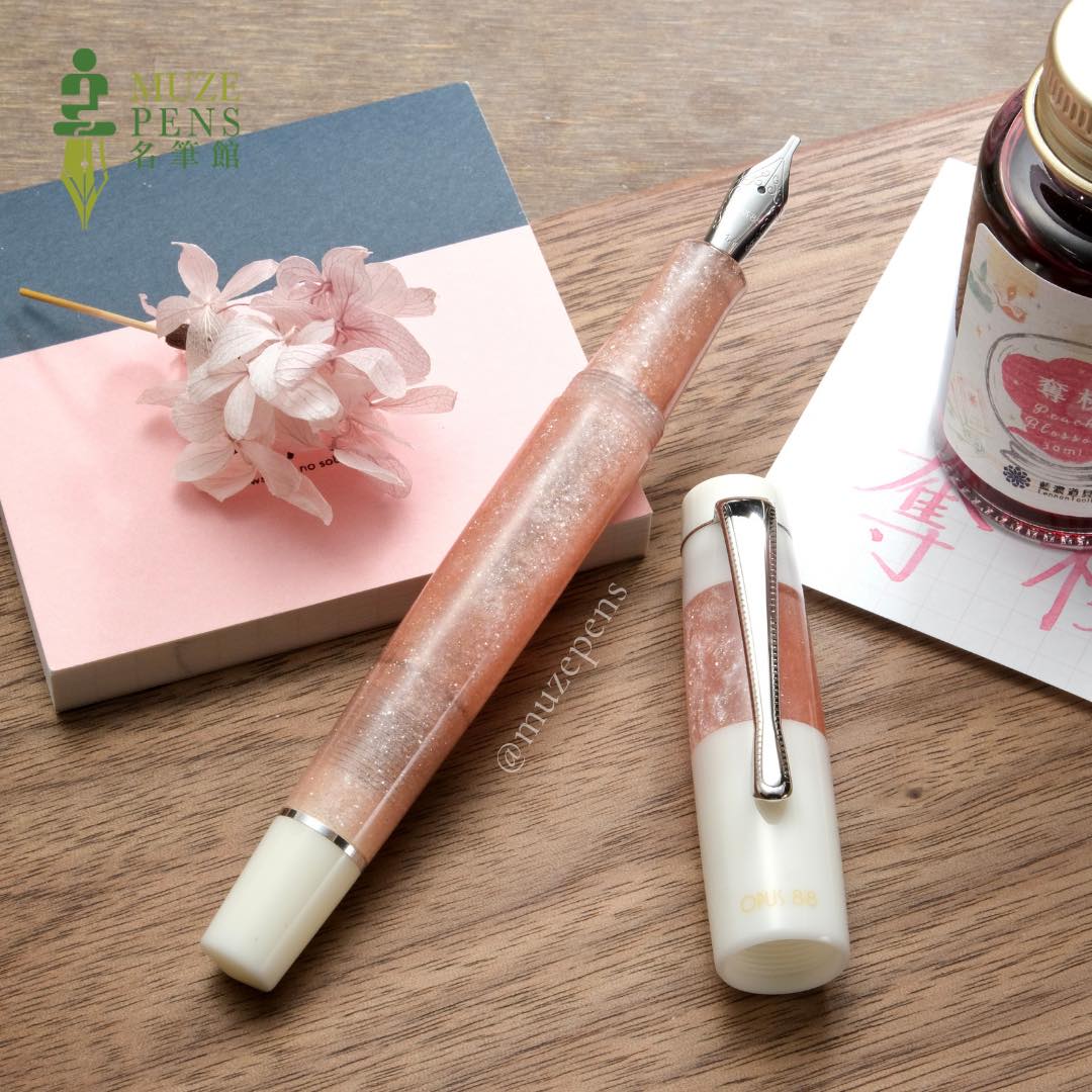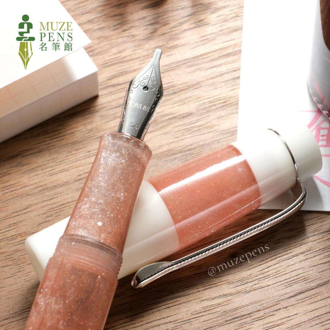 Opus88's Koloro fountain pen features a bold design with adjoining white resin and translucent pink acrylic materials, which makes it more challenging to manufacture. The pink translucent acrylic pen barrel sparkles under the light! In addition, its slim body makes a comfortable size for those with smaller hands.