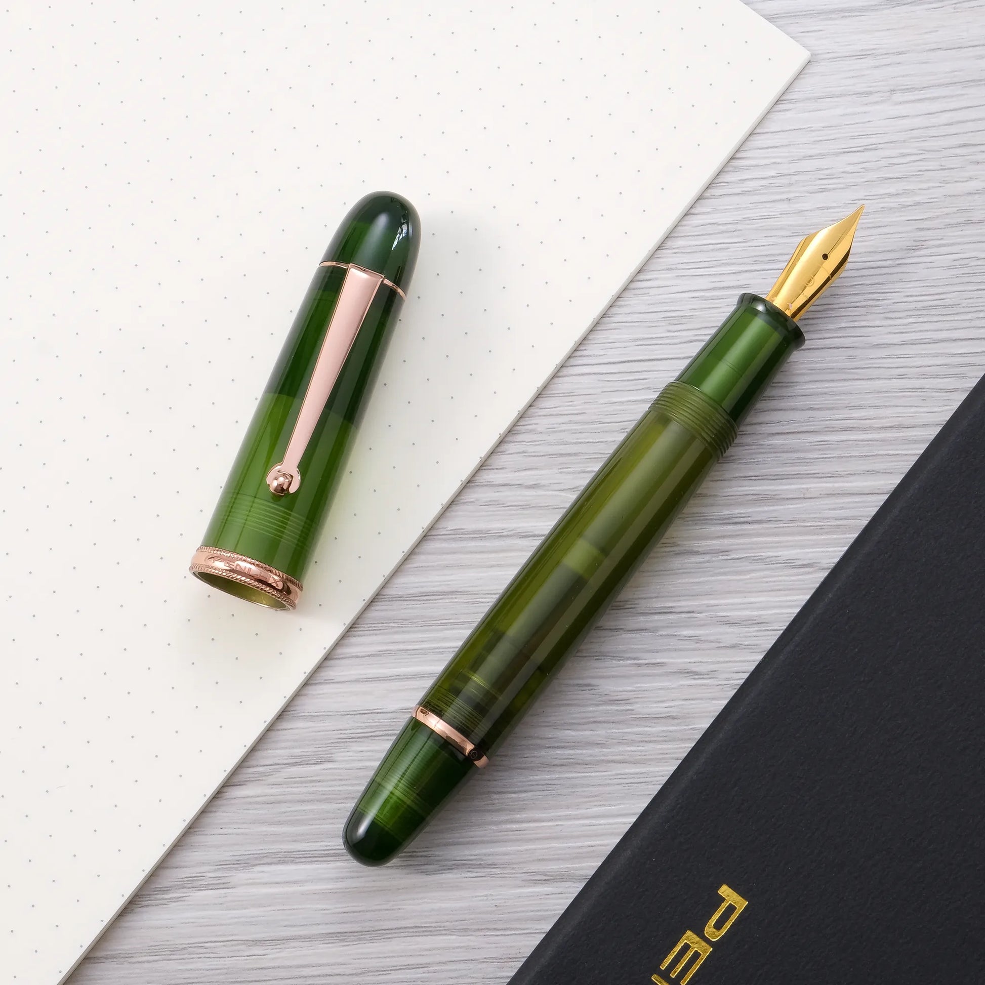 The Masterpiece Grande Rainforest fountain pen features a semi-translucent olive pen body, complimented by rose gold trim.