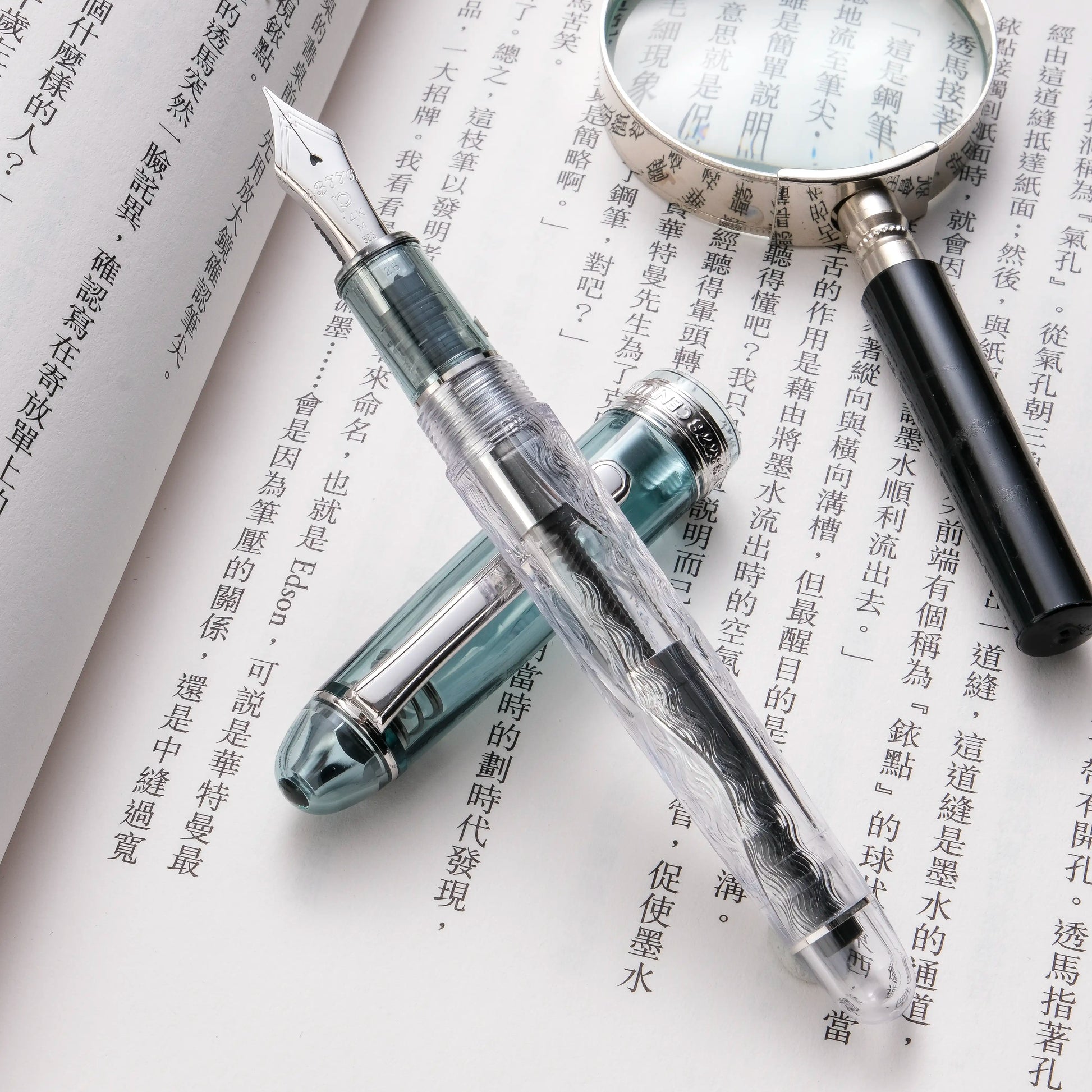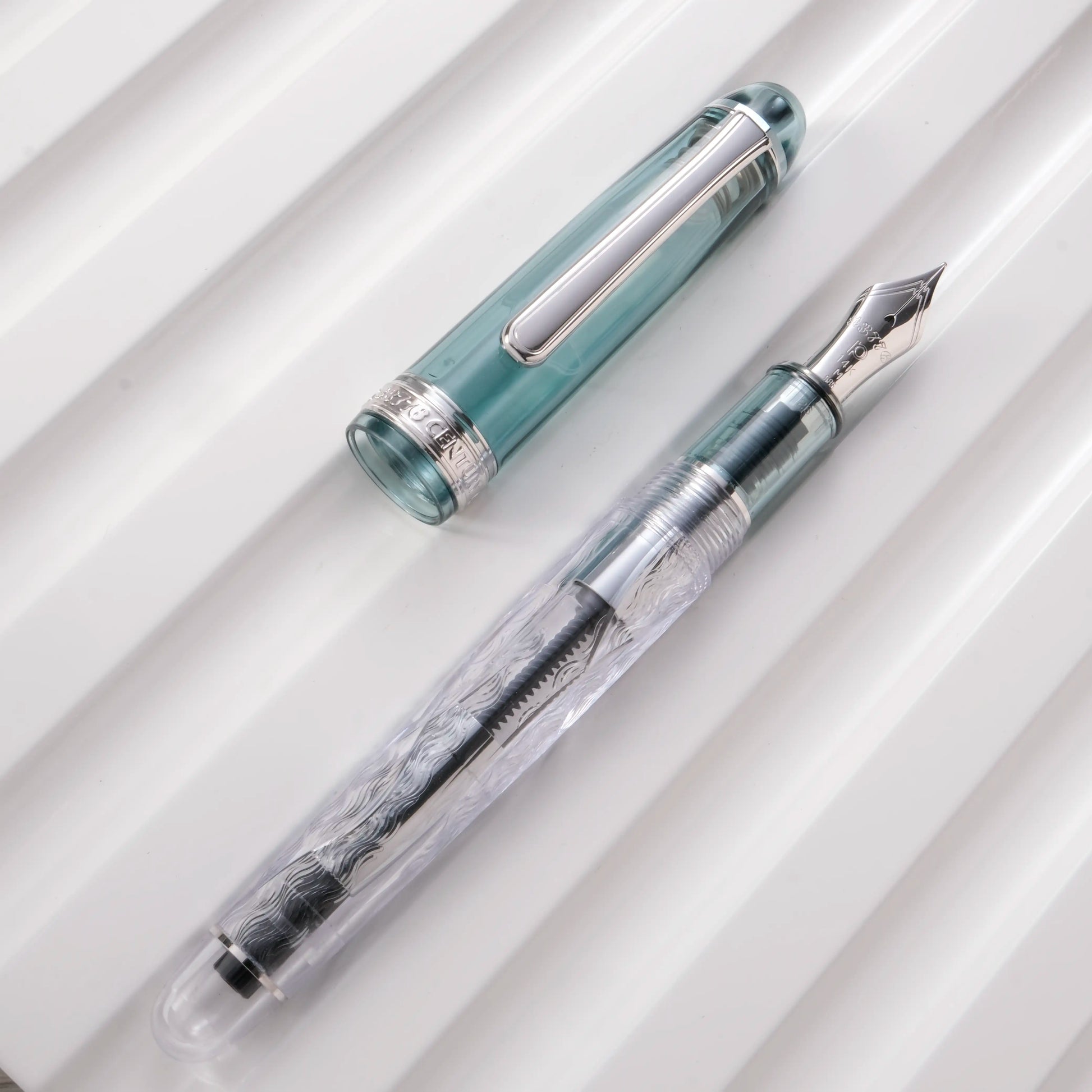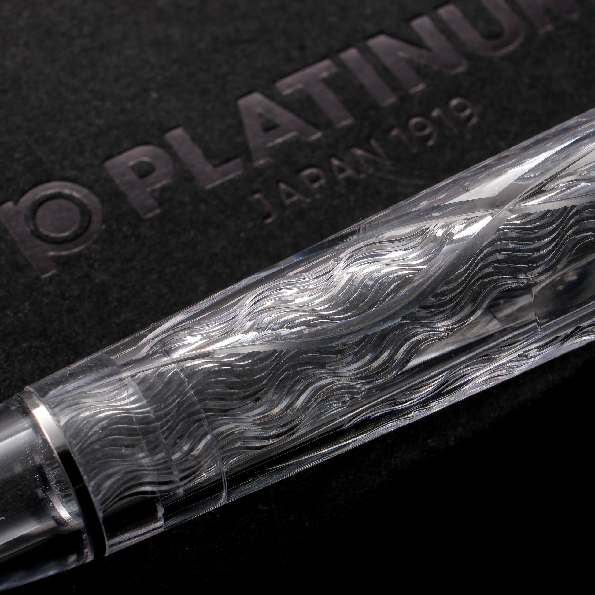 The transparent barrel is adorned with two types of engravings: one is the deep long V-groove carving; the other is the intricate, flowing, wavy guilloche patterns mimicking the gentle undulations of silk clouds drifting across the mountain. By intentionally leaving some areas unengraved, the presence of clouds floating in the sky is accentuated. This interplay of texture and light creates an atmosphere of serene elegance of the Fuji mountain cloudscape.