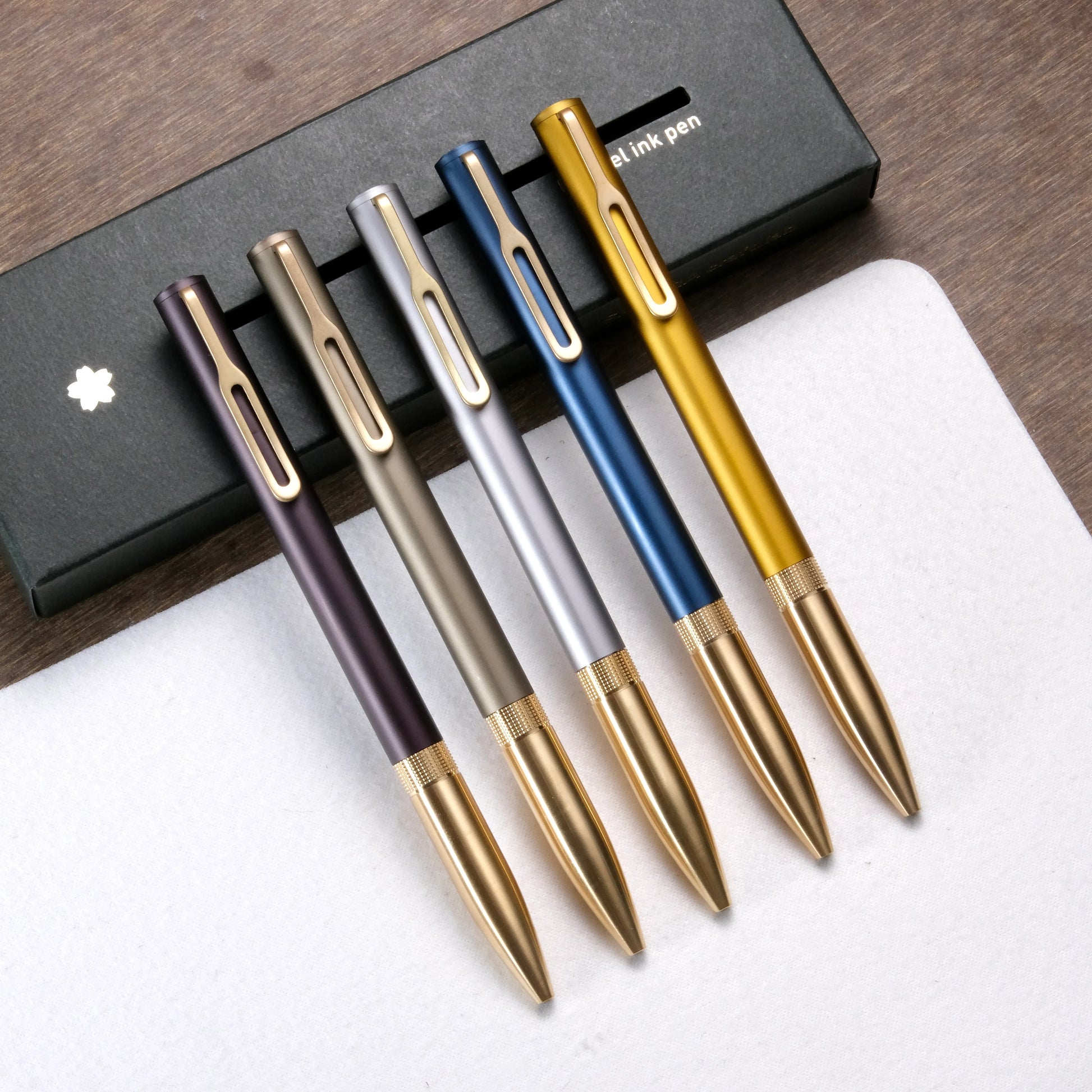 The two-toned pen body is crafted in two parts. The tapered grip section is made of brass, offering a reassuring weight and a comfortable grip that feels grounded in your hand. The upper section is made of anodized aluminum, plated in five different soft color choices: Stormy Gray, Sage Green, Dijon Yellow, Midnight Blue and Plum Wine.
