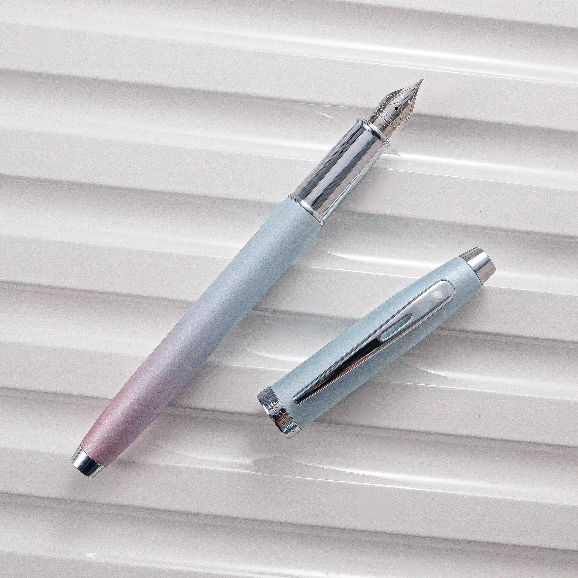 Experience the perfect blend of elegance and functionality with Sheaffer 100 Expressions Blue and Pink Pearlized Gradient Fountain Pen. This exquisite writing instrument has a pen body exhibiting a unique tonal gradient that fades seamlessly from light powder blue to gentle pink in a pearlized finish. Paired with polished chrome details and nib, you got a perfect pen for someone who possesses a tender, gentle and kind-hearted personality.