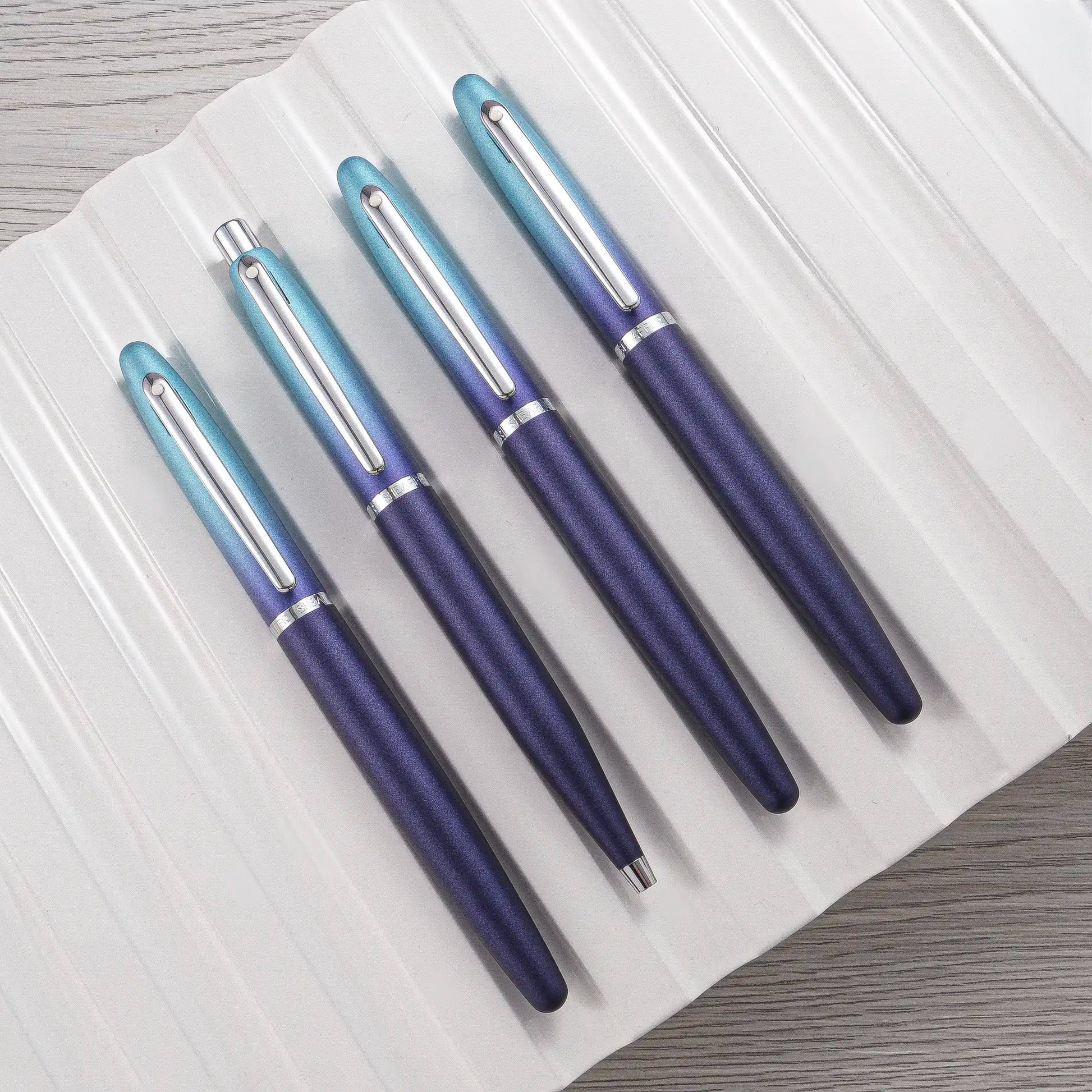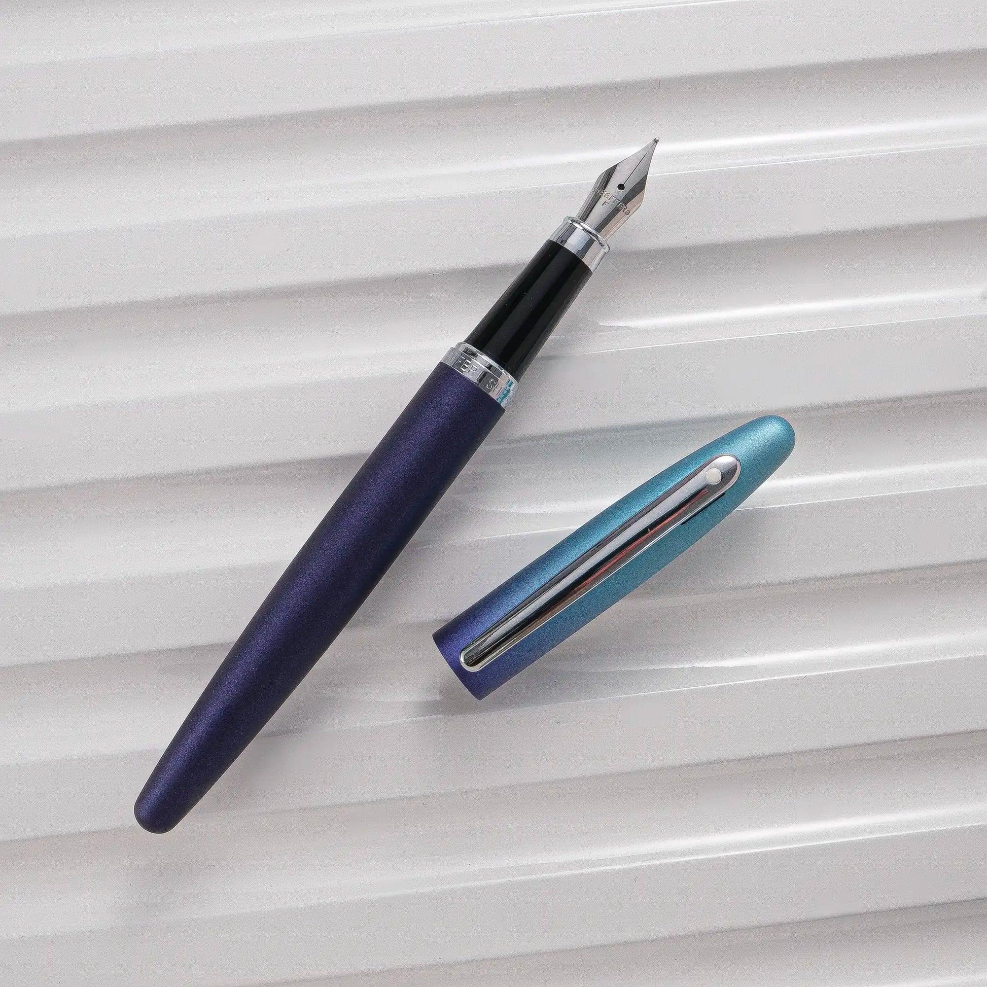 Just as the name suggests, Sheaffer VFM 9430 Expressions Blue and Purple Pearlized Gradient Fountain Pen embodies a blend of duo-chromatic and pearlized finish, with a gradient tone that highlights the strong personality. From midnight purple to sky blue, the day begins with journaling. When the cap is posted, the gradient shifts, marking the arrival of the night. This is surely the pen for people who possess a dynamic personality!