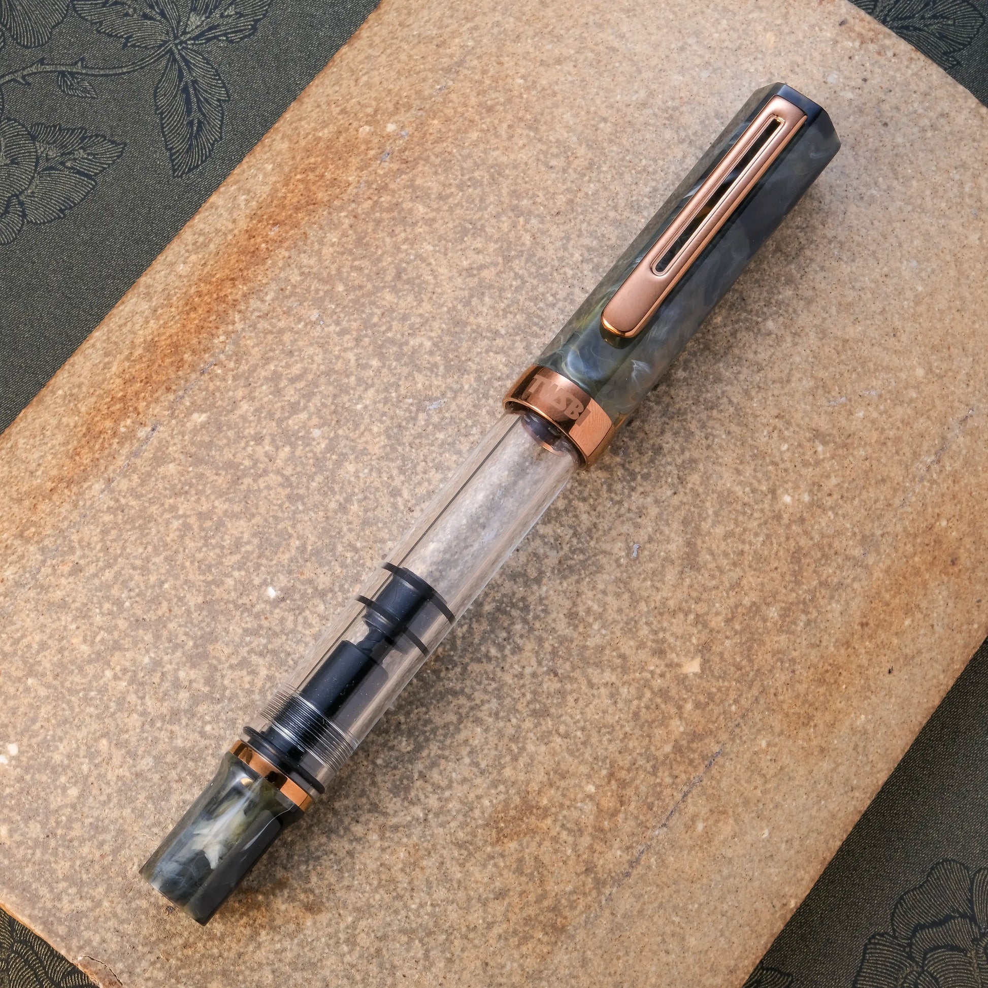 The making of Serpentine Bronze involves mixing dark green with white/yellow gold acrylic for the cap and piston knob and pairing with a bronze nib and trim. The colors of the acrylic are mixed during the injection molding process to create unique patterns of swirling colors and no two pens are the same!